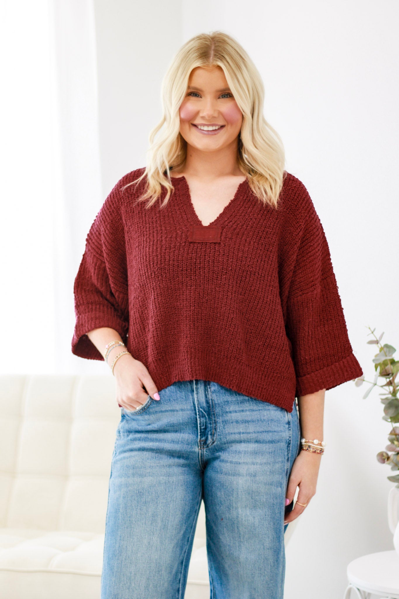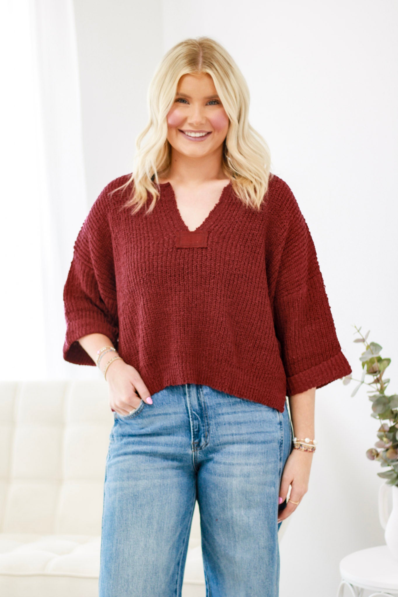 Textured long sleeve sweater top featuring a notched neckline with a front patch detail, rolled 3/4 sleeves, two side slits and is a slightly cropped but boxy body.