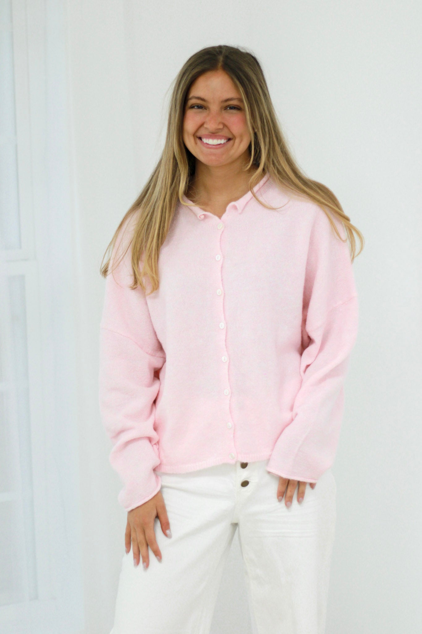 Feminine charm meets versatile style in this classic button-down sweater. The soft pink hue and refined silhouette create an effortlessly polished look that transitions seamlessly from office to weekend, making it a wardrobe essential you'll reach for season after season.