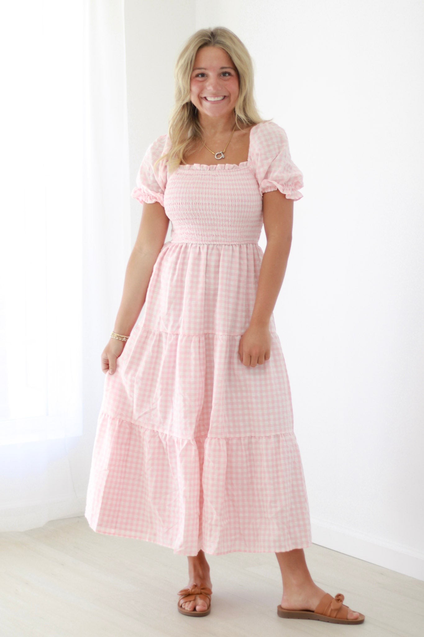 Embrace effortless charm in this smocked gingham dress that's equal parts sweet and sophisticated. The fitted smocked bodice creates a flattering silhouette while offering comfortable stretch that moves with you throughout the day.