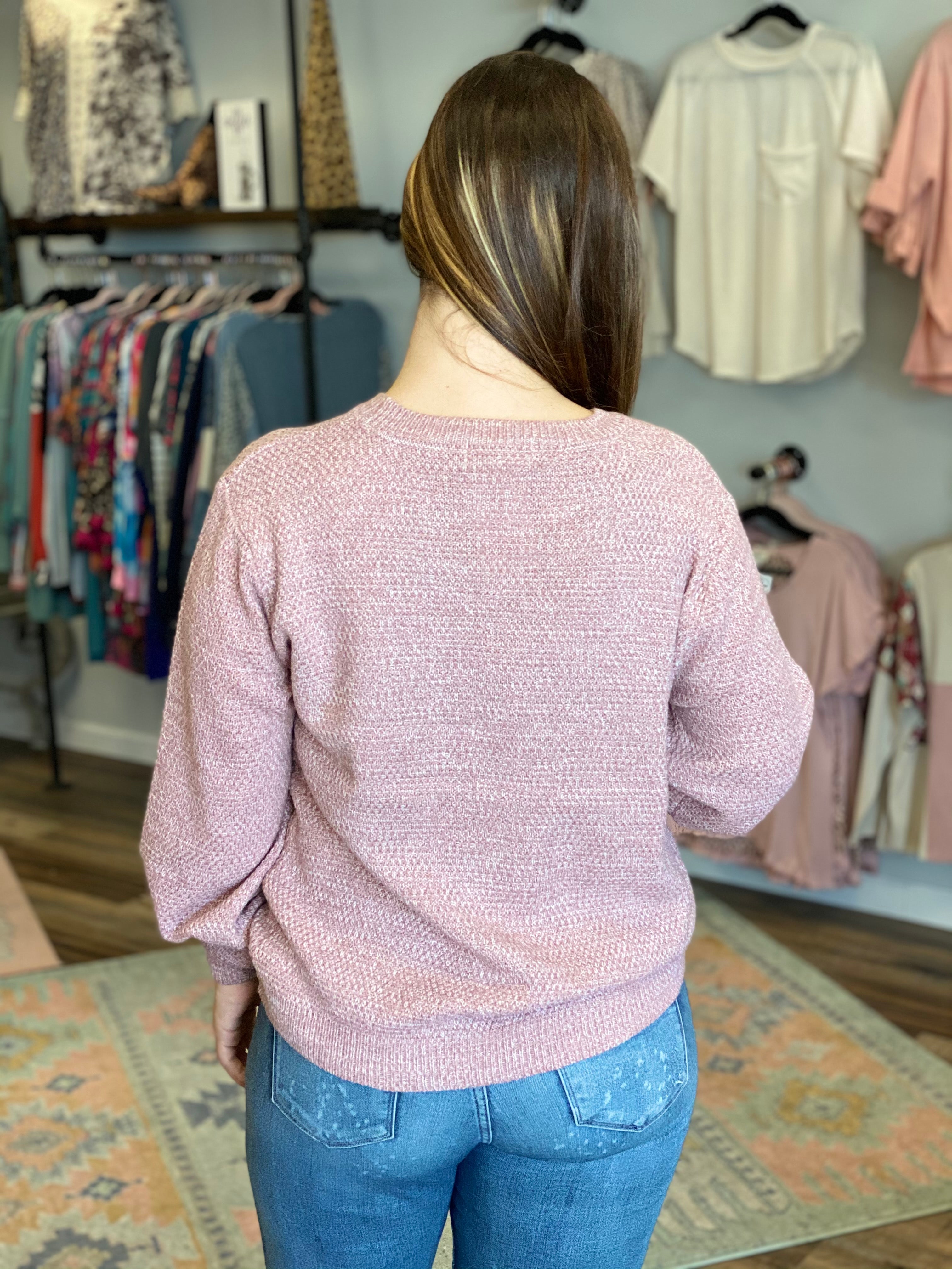 Winter wishes and eskimo kisses! This blush sweater is an easy pick. Cute, comfy and our favorite color!