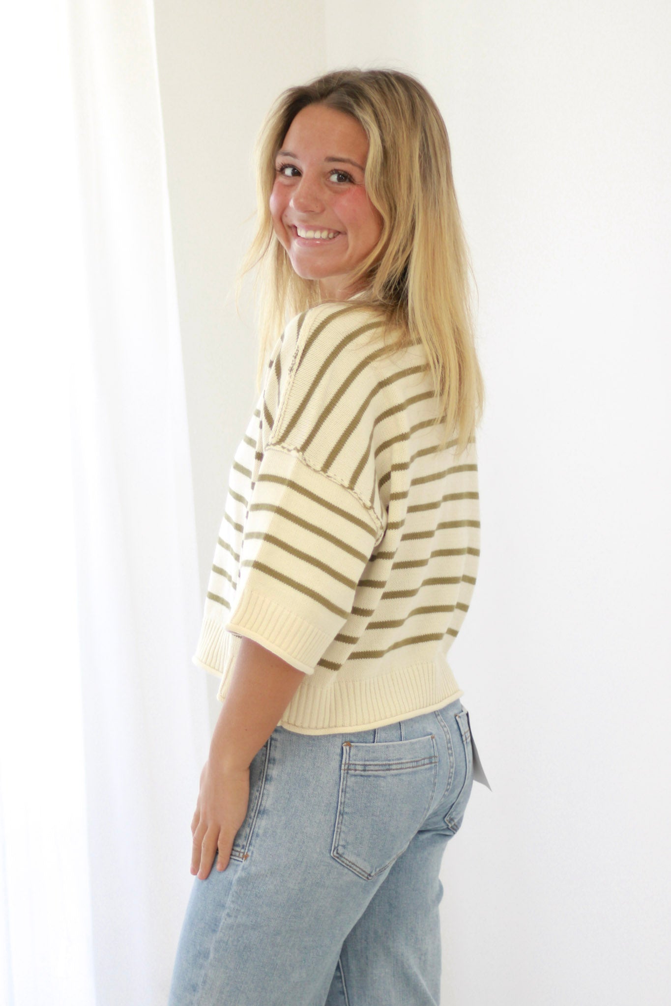 Effortless style meets everyday comfort in this classic striped sweater. The rich olive and cream stripe pattern and relaxed silhouette create a versatile piece that works from coffee runs to casual dinners, making it an essential addition to your sweater collection.