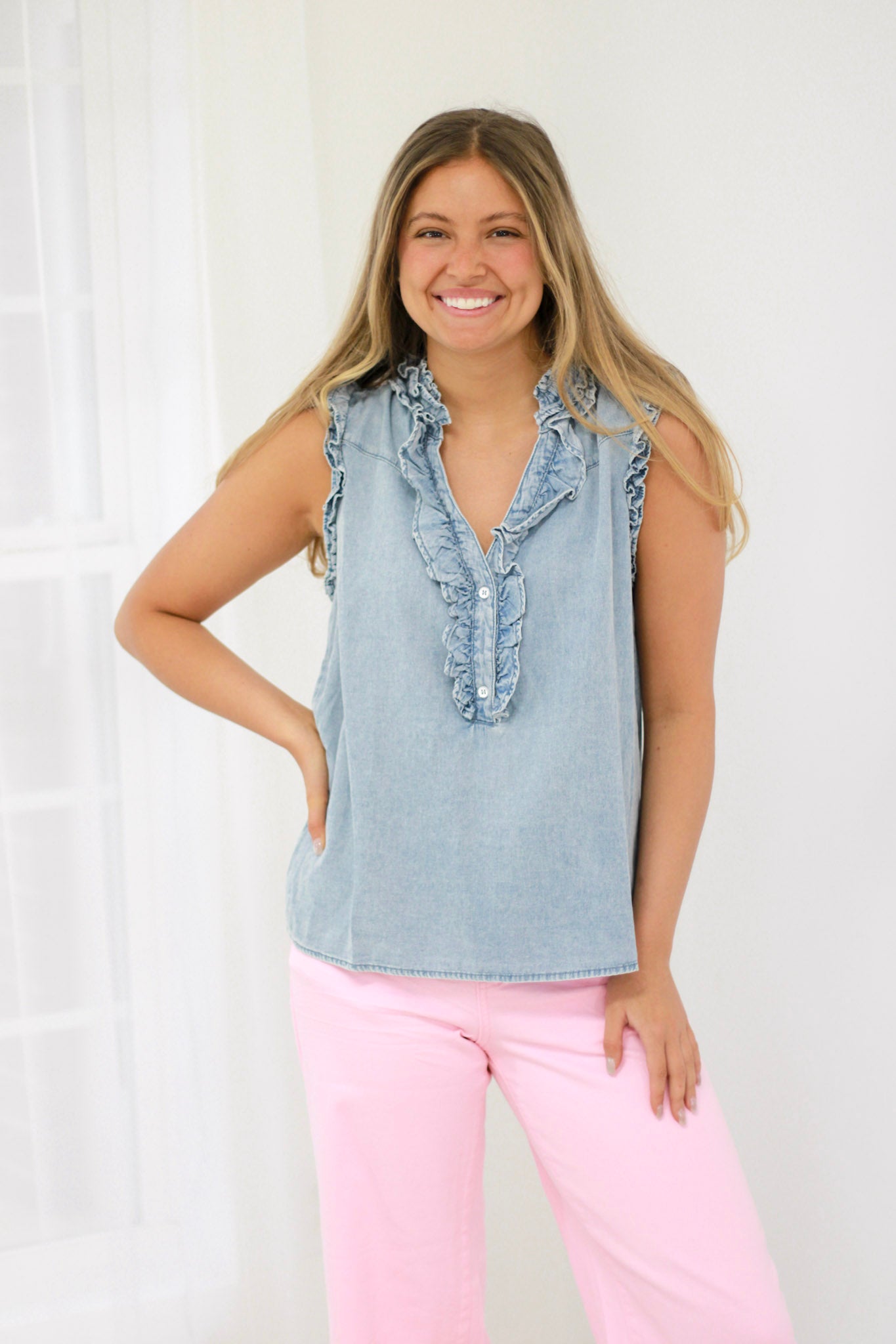 This chambray tank walks the perfect line between polished and relaxed. The soft chambray fabric brings an elevated, lived-in feel while the sleeveless silhouette keeps things effortlessly cool. It's the kind of piece that anchors your wardrobe—easy to style, impossible to overthink.