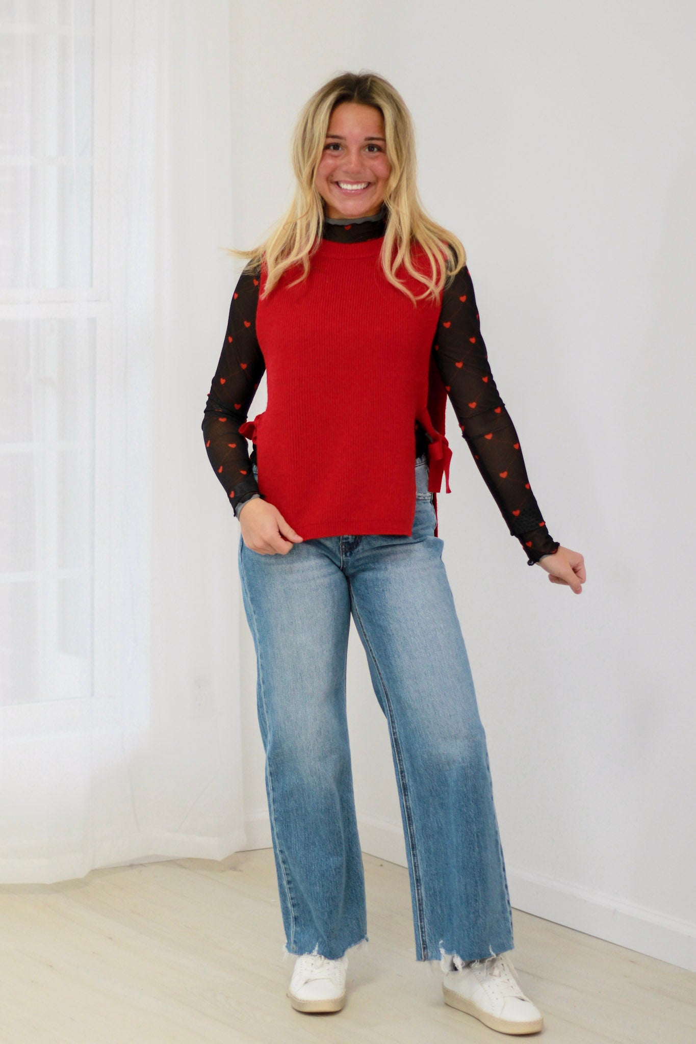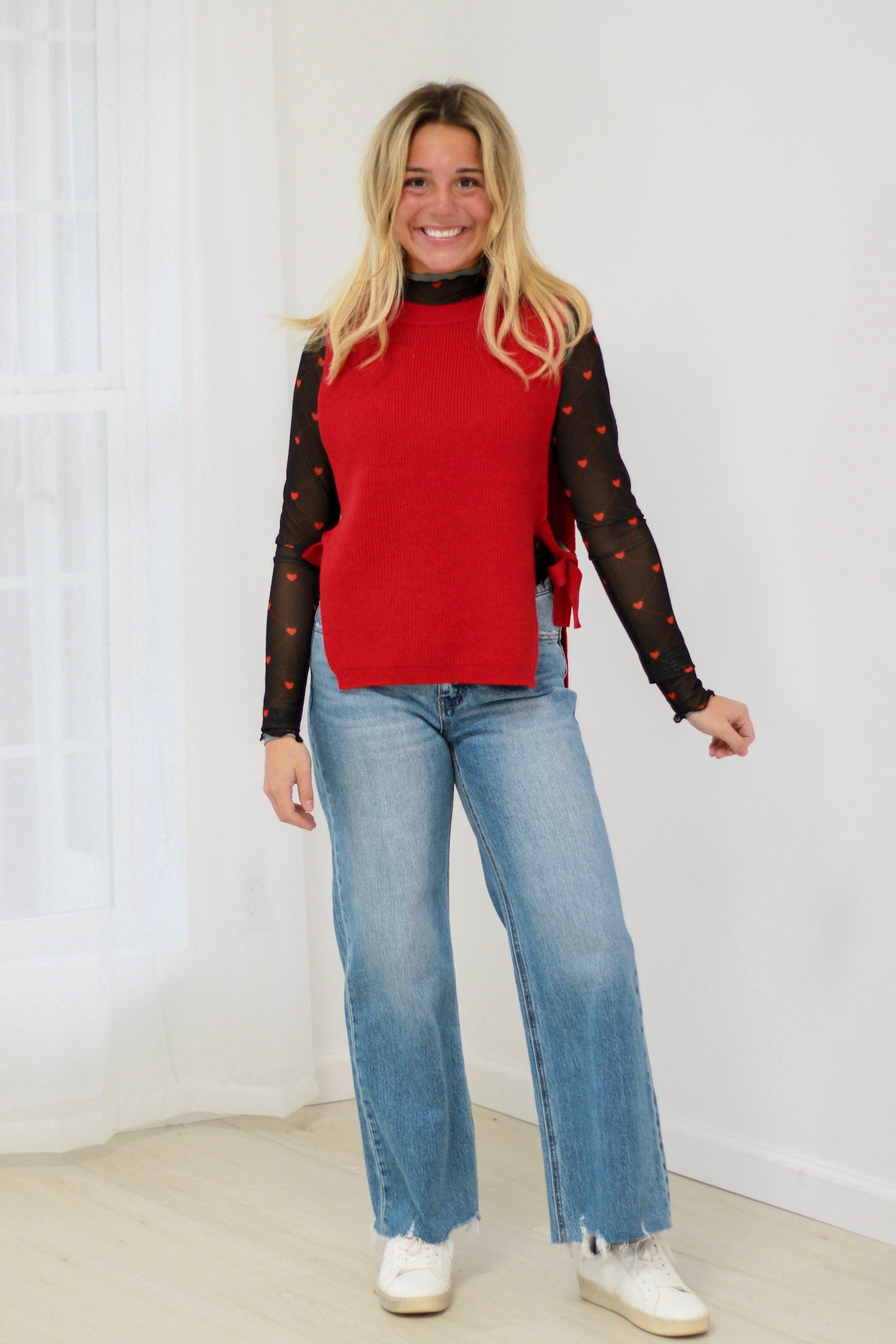 Sheer mesh construction in classic black showcases delicate red heart details for a romantic, layered-ready look. Perfect as a standalone piece or styled under a sweater vest for added dimension and warmth. True to size for an effortless fit.