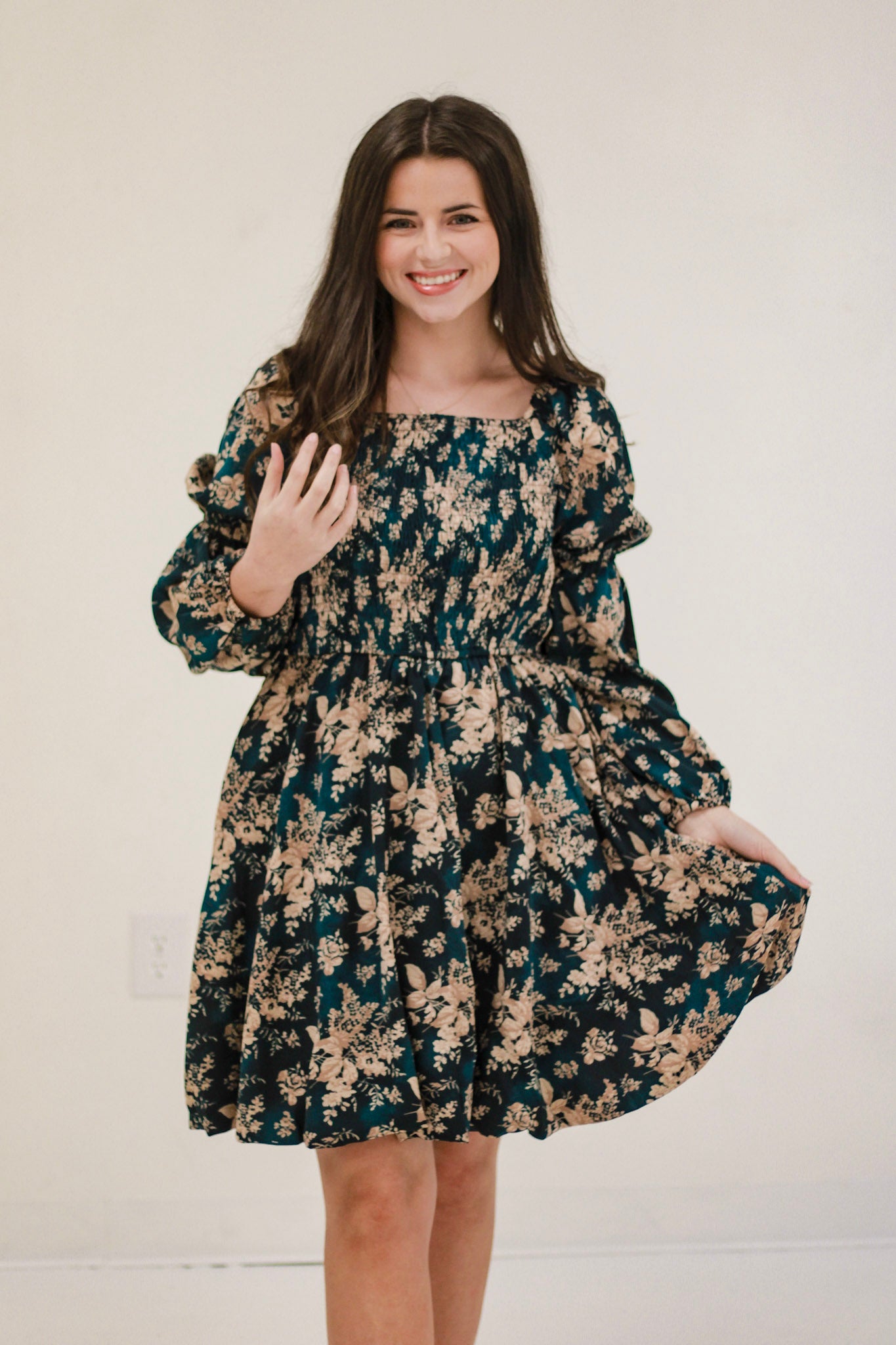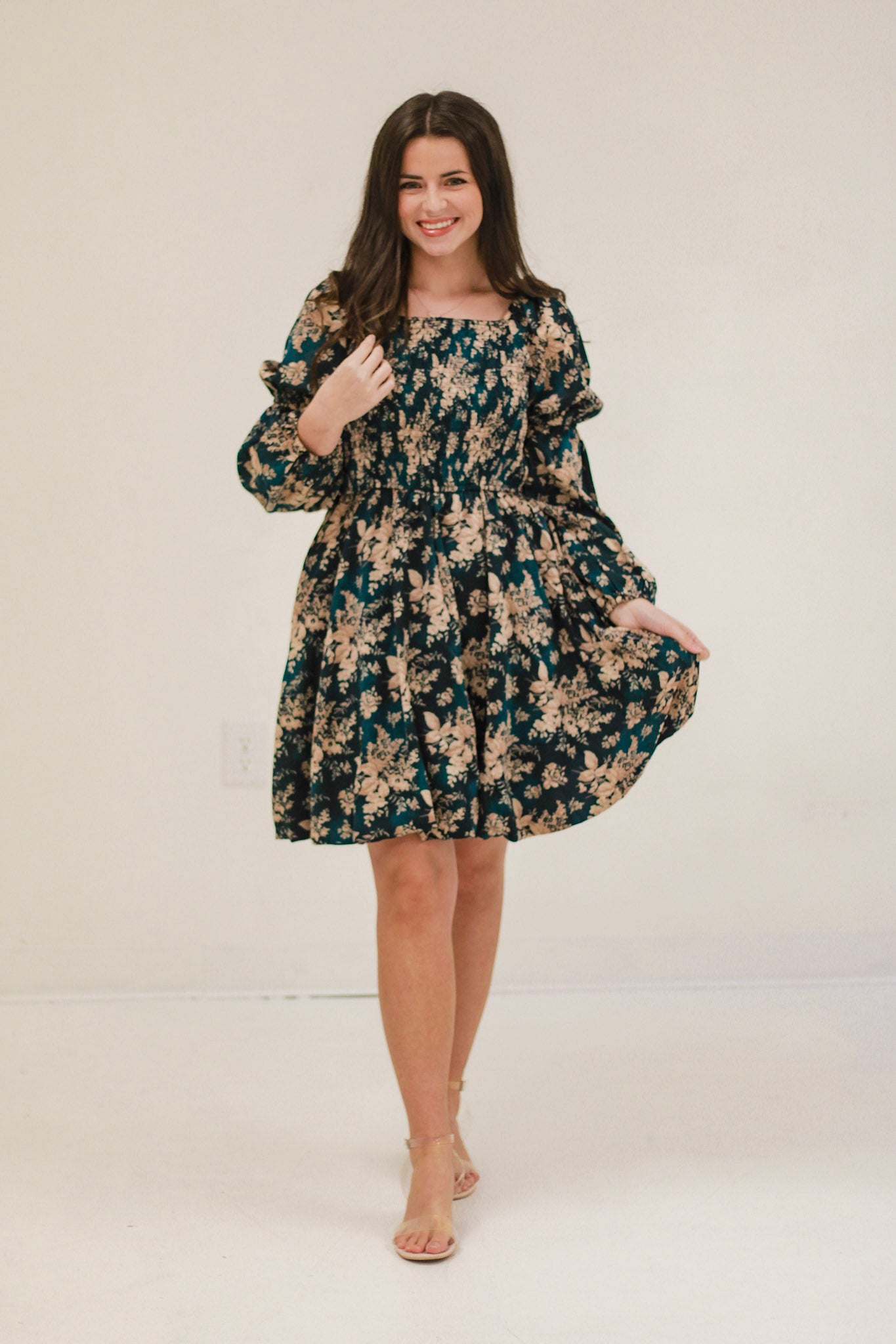 Floral dress with a dark green base (hint of dark teal)