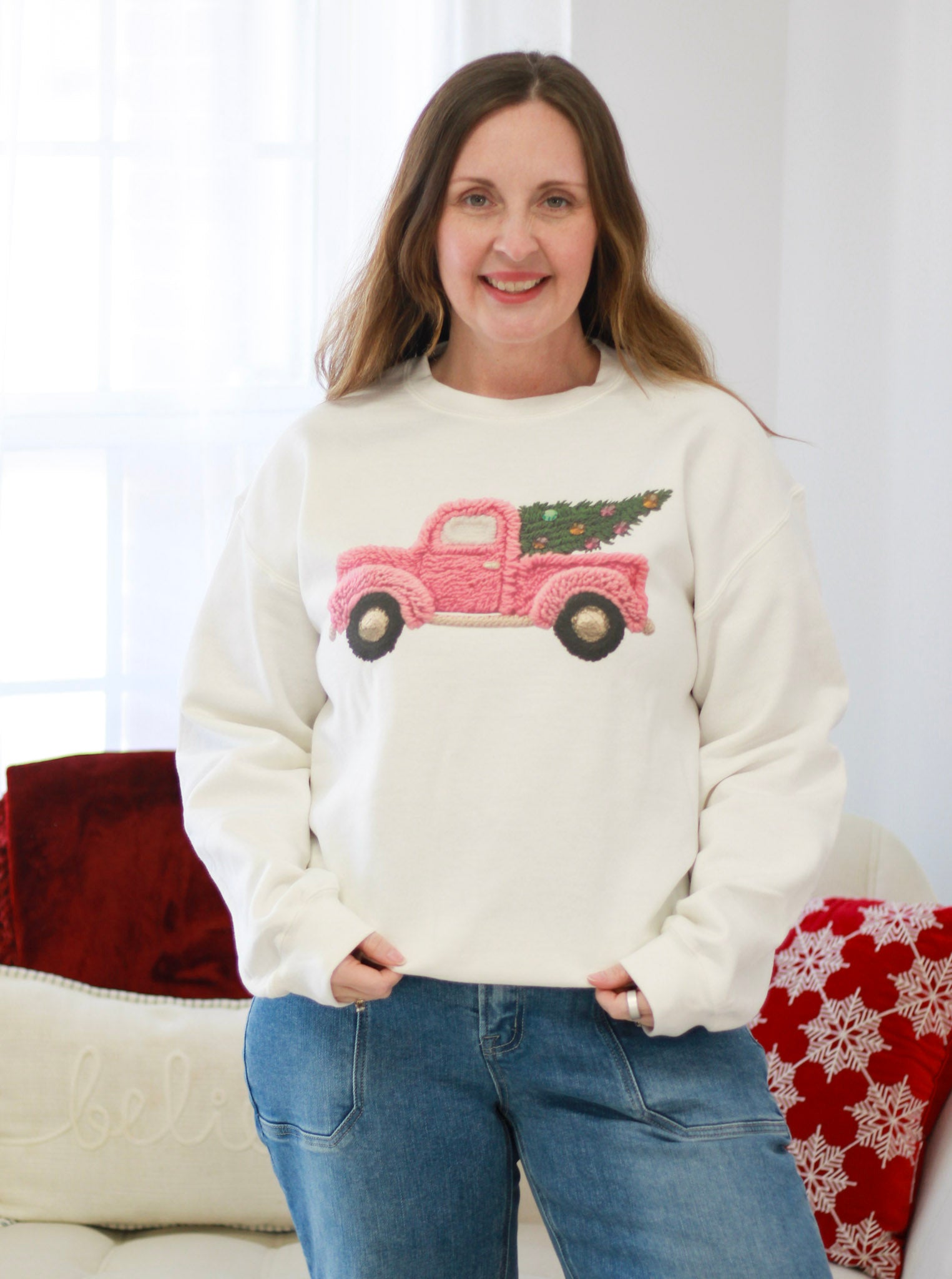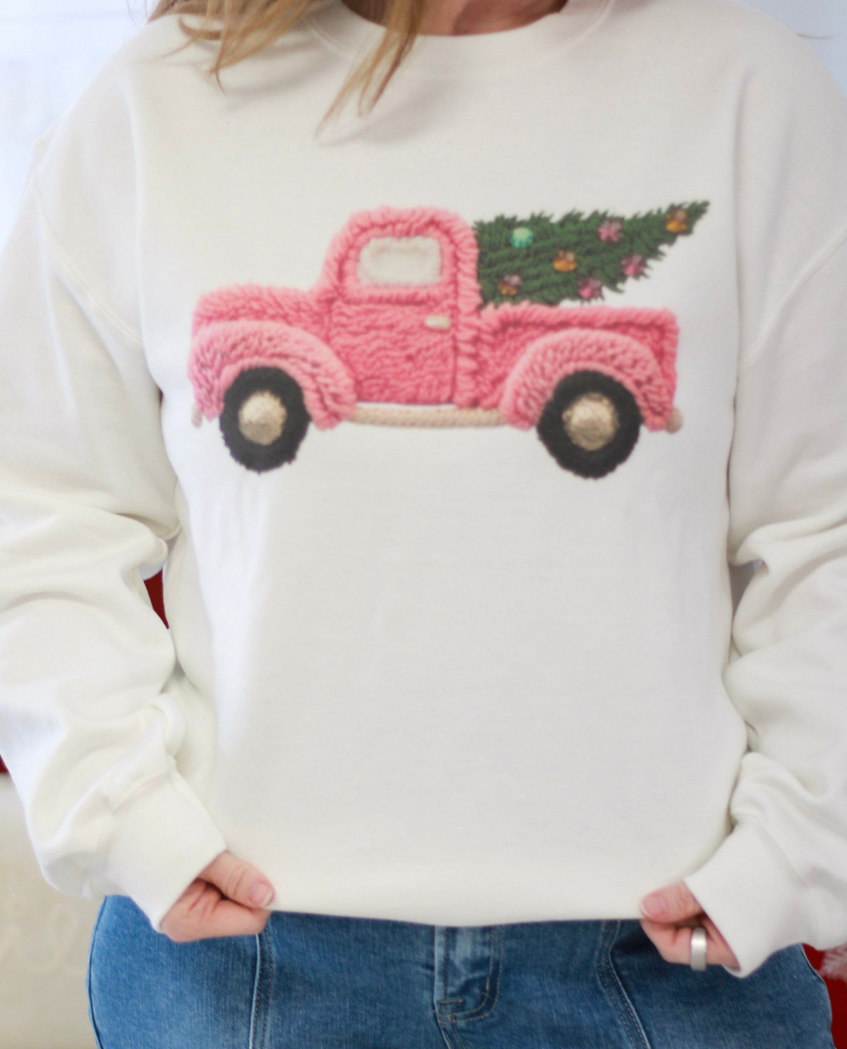 Adorable faux yarn Christmas tree nestled in the bed of a truck, all set against cozy white fleece. This sweatshirt offers a relaxed, comfortable fit—size up if you prefer extra room. Model pictured is wearing a medium.