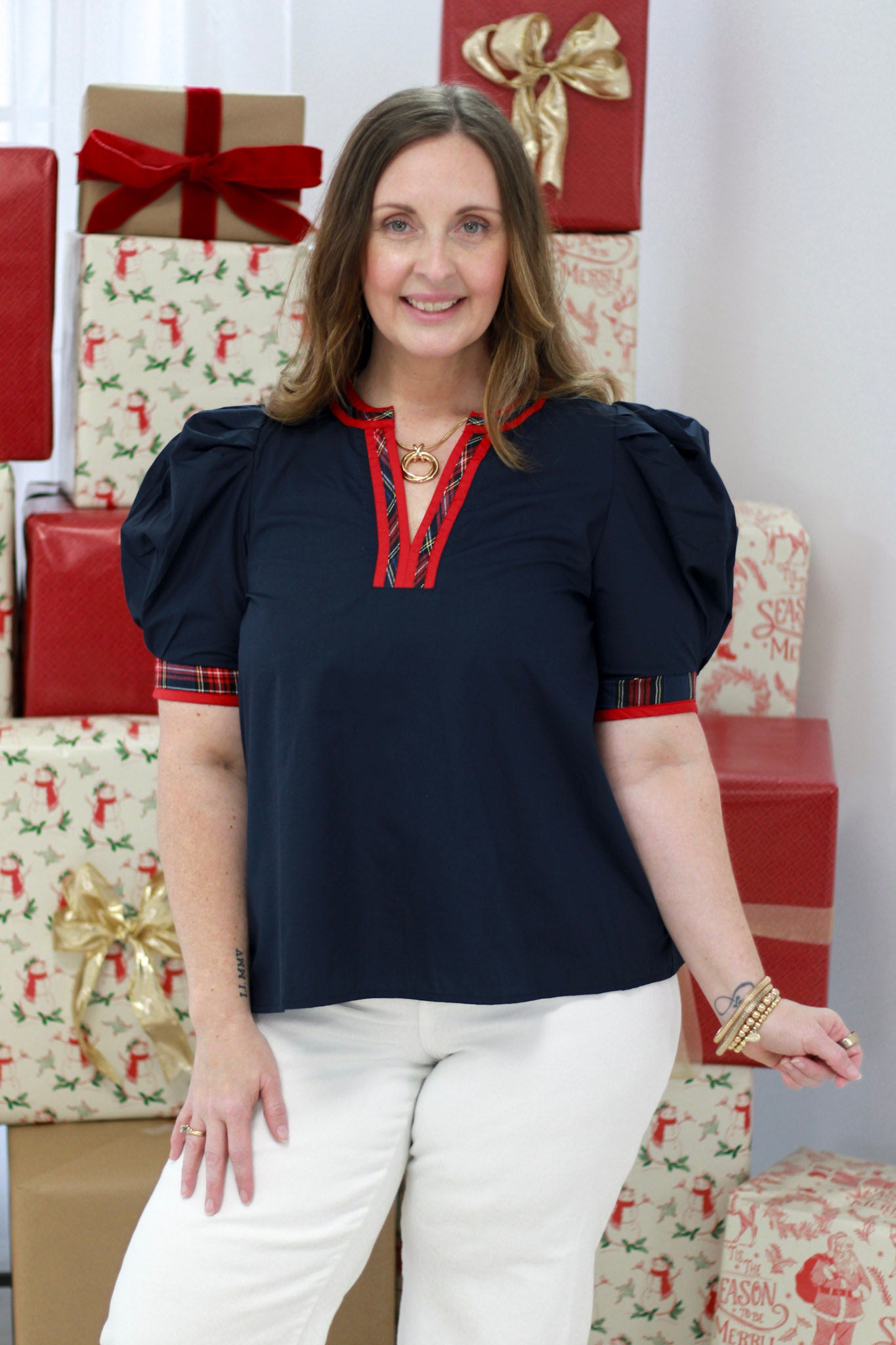 This navy blouse features a flattering V-neckline and eye-catching red plaid accents that bring festive charm to your wardrobe. Puffed shoulders add a playful, on-trend silhouette that works beautifully for both casual and dressed-up occasions. True to size for an effortless, comfortable fit.