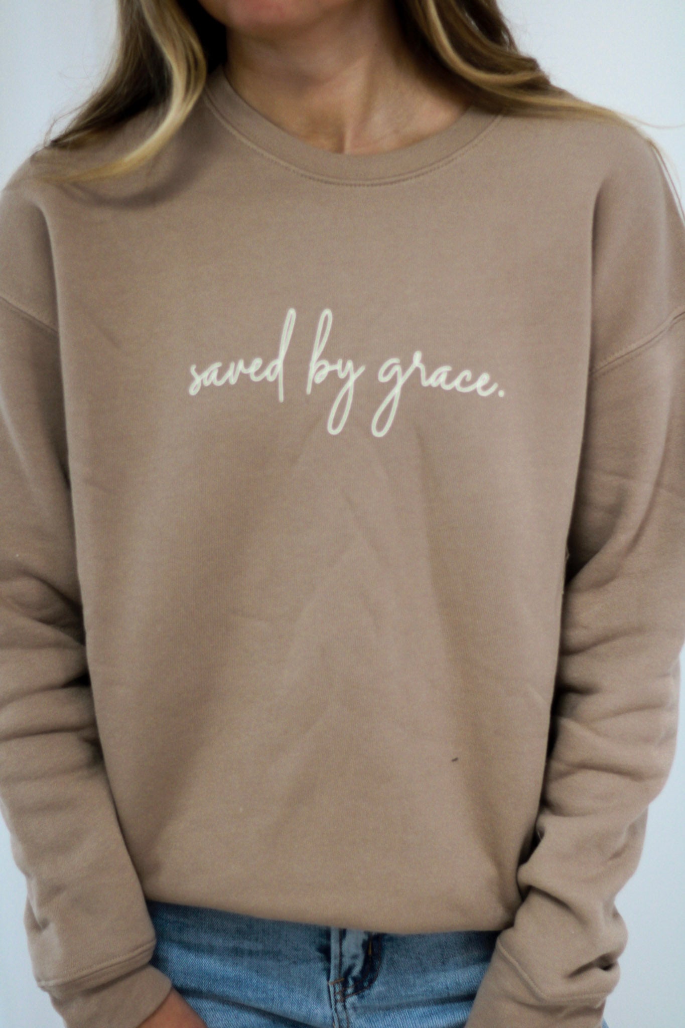 Cozy comfort fleece with an inspiring Saved by Grace graphic on the front—a customer favorite that's finally online. True to size for a classic fit, or size up for that relaxed, oversized vibe. Perfect for layering or wearing solo on cooler days.