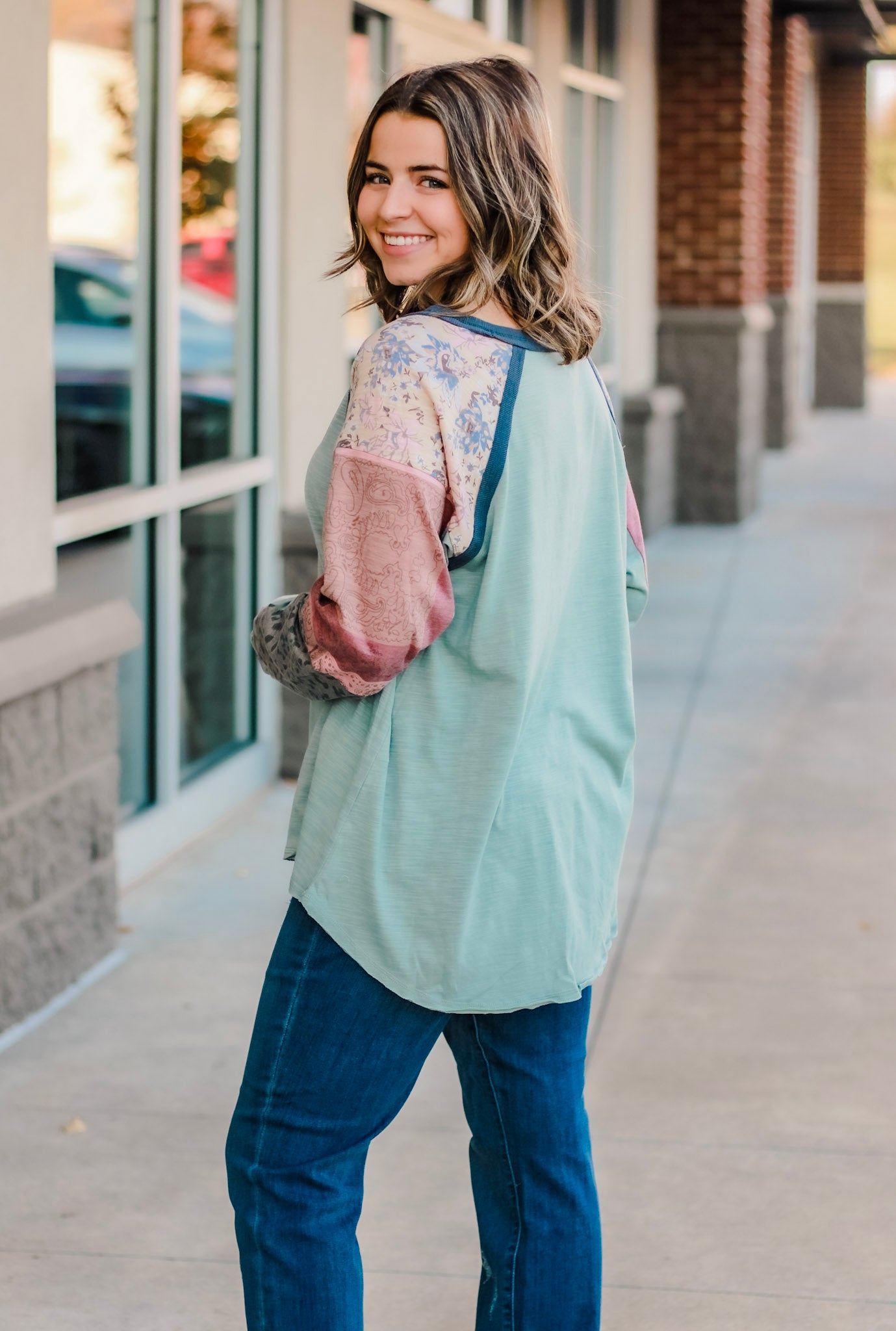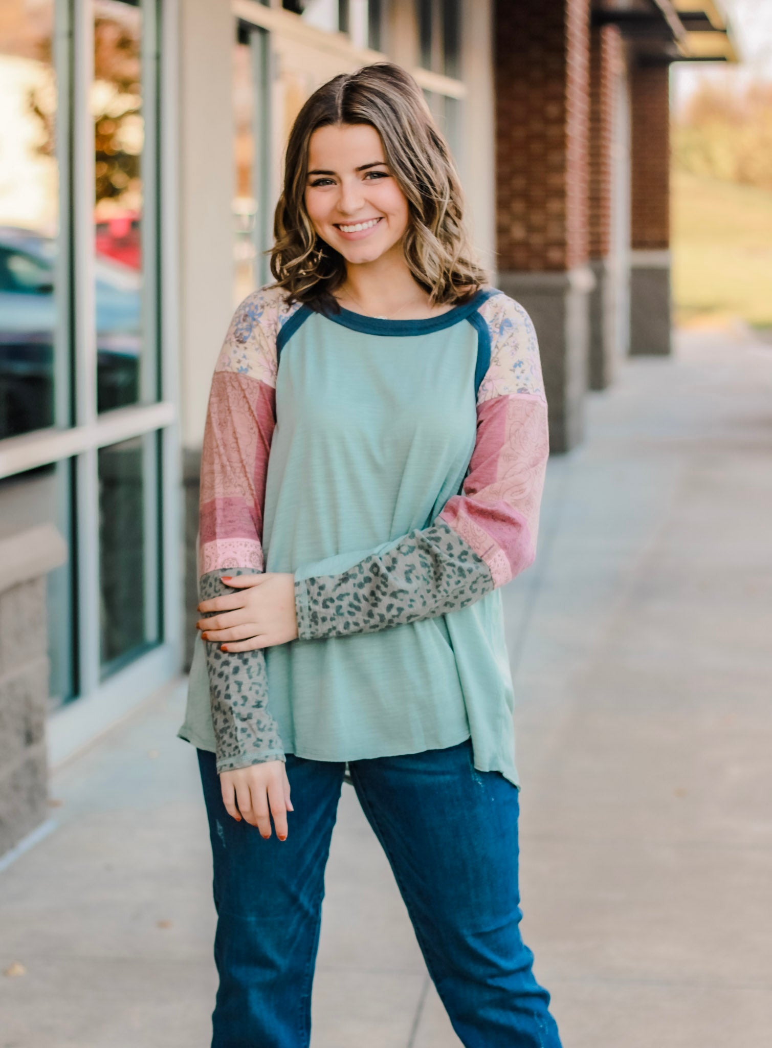 This light blue top is the cutest addition to your closet. It has quilted pattern sleeves that add the perfect touch to your look! Jazz up your look with this top, your favorite jeans, and some big earrings!