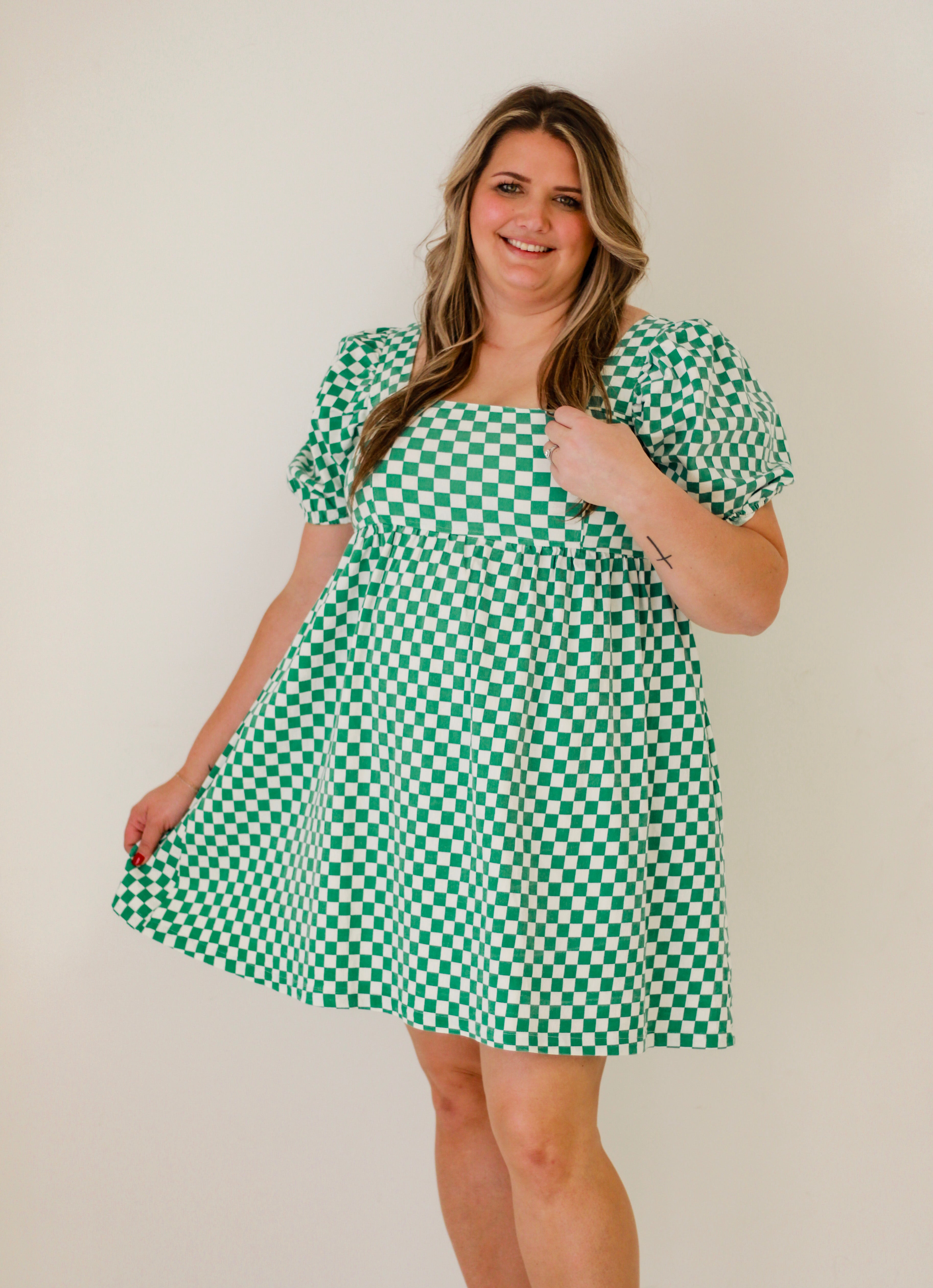 - Green/white check dress