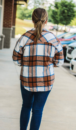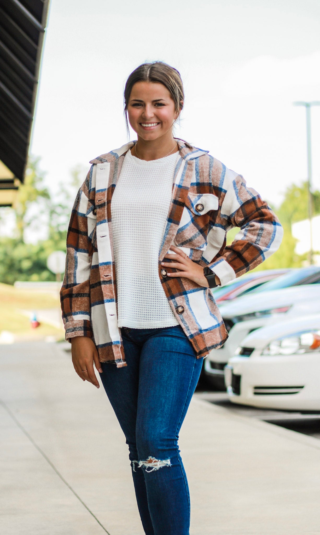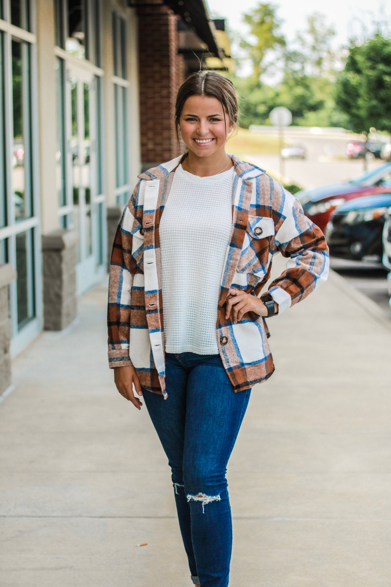 Flannels are going to be HOT this fall! This one is cozy and mixes orange, white, and navy to create the most beautiful plaid!