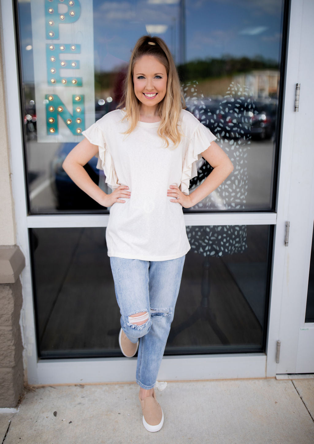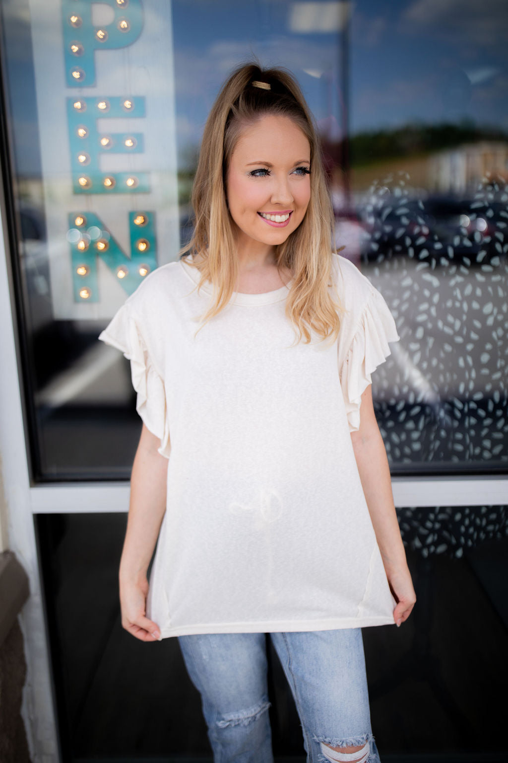 An easy top that pairs well with anything! Featuring ruffled cap sleeves, the cream color is neutral enough to go with any bottoms!