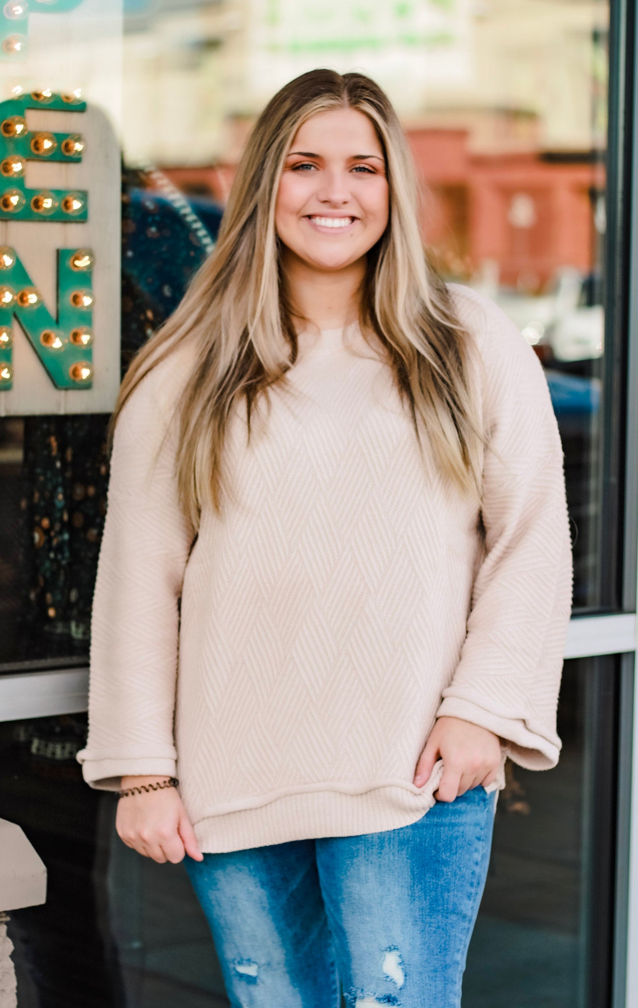 The subtle chevron pattern on this sweater is gorgeous! The edges are so unique, making this easily one of our favorites of the season. It's perfect for that comfy cozy feel you're looking for while running all your weekend errands.