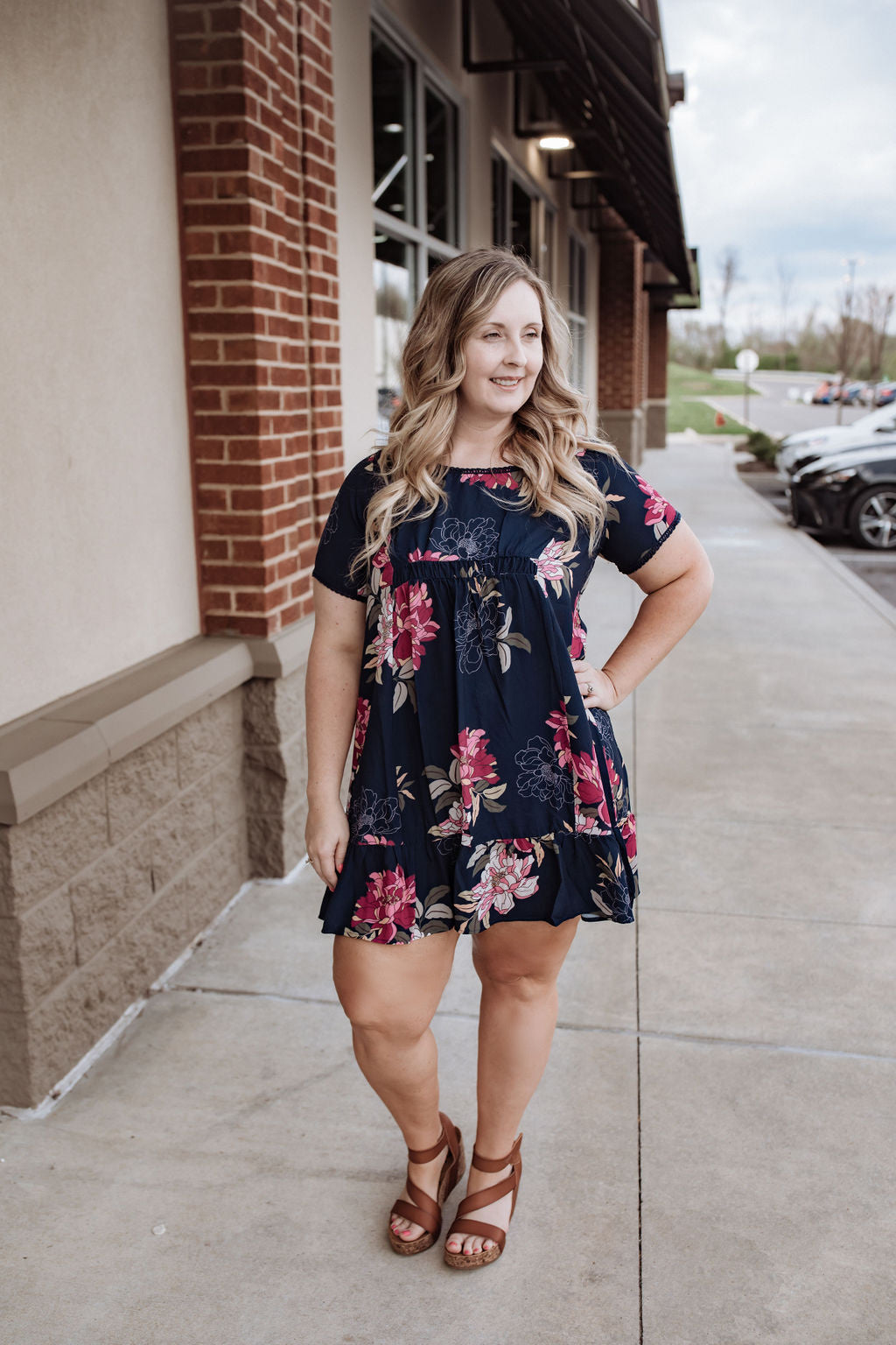 One of our favorite dresses in store! The beautiful pink floral print pops on the navy base.