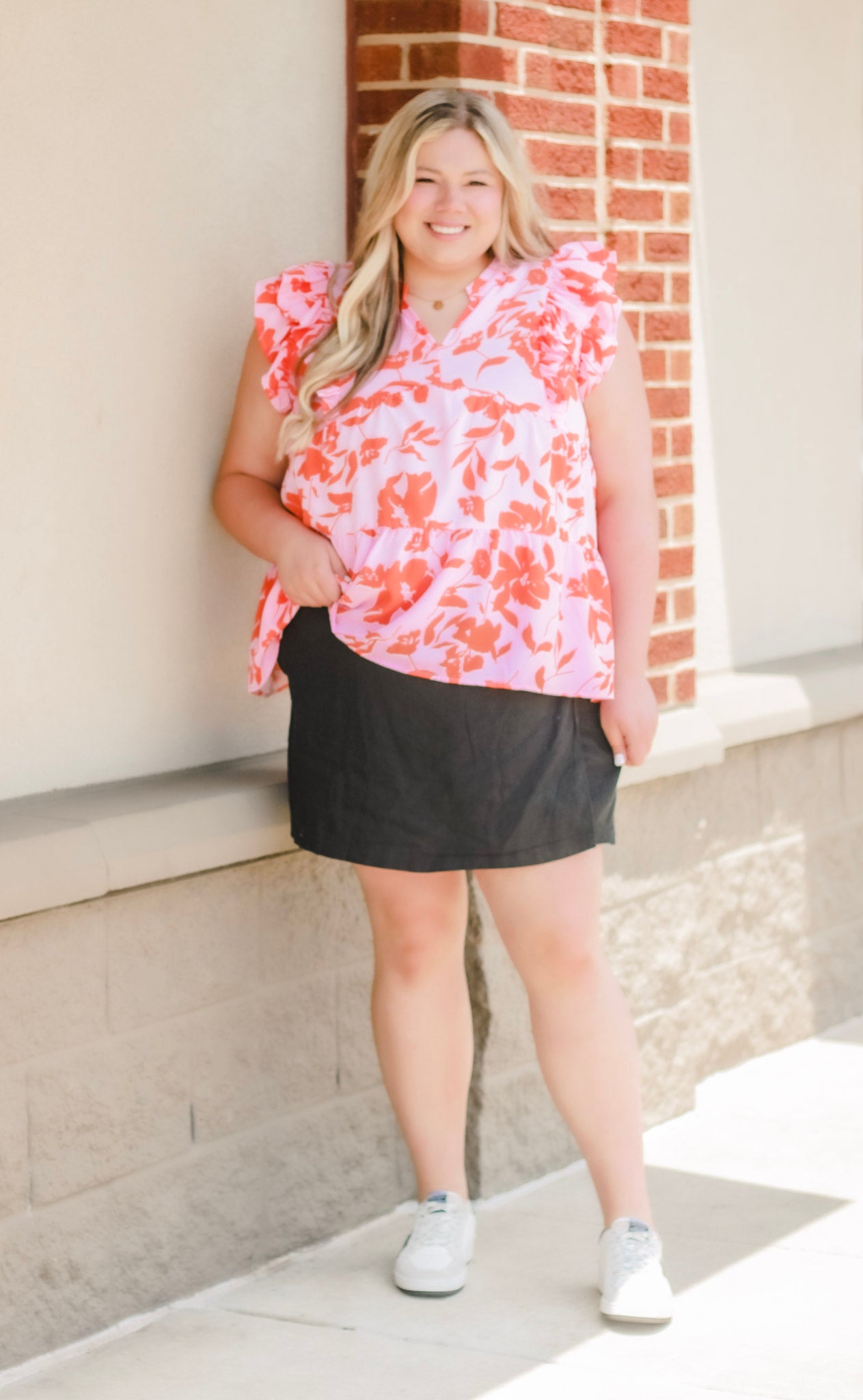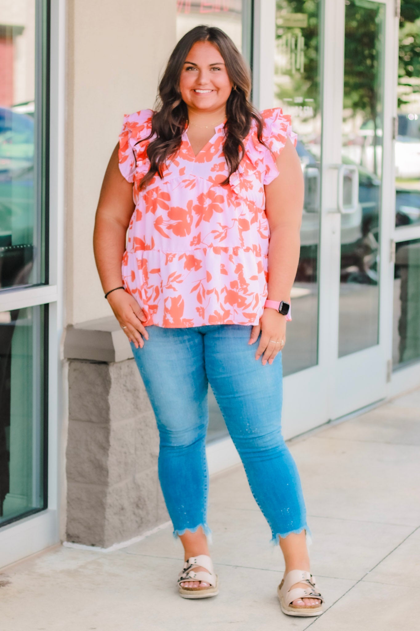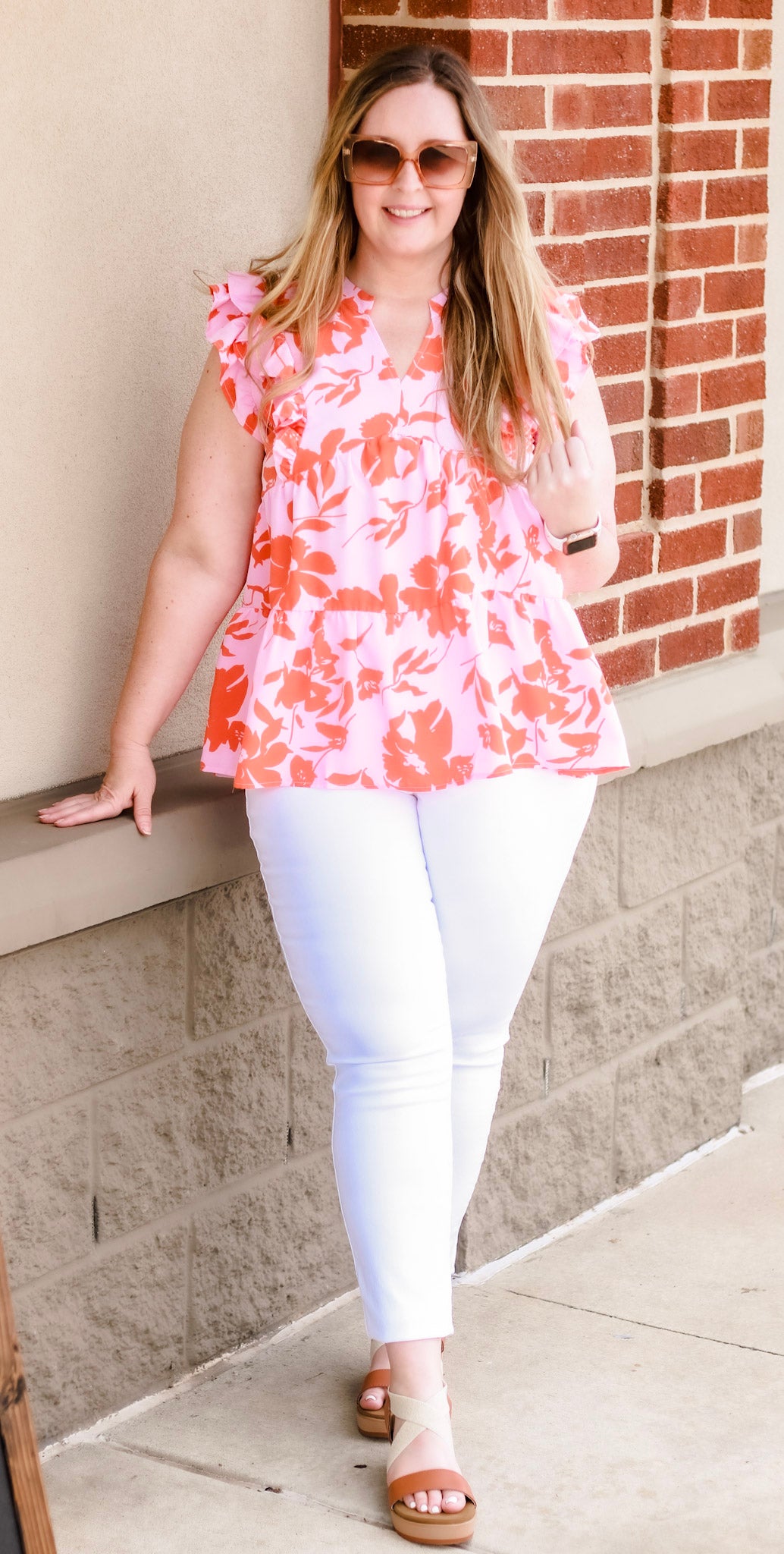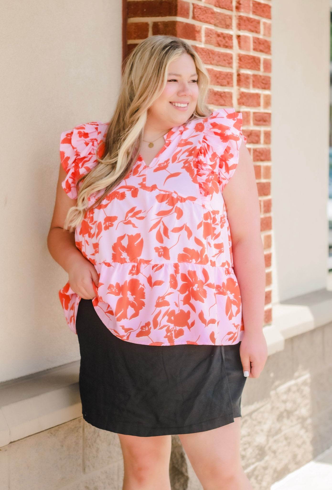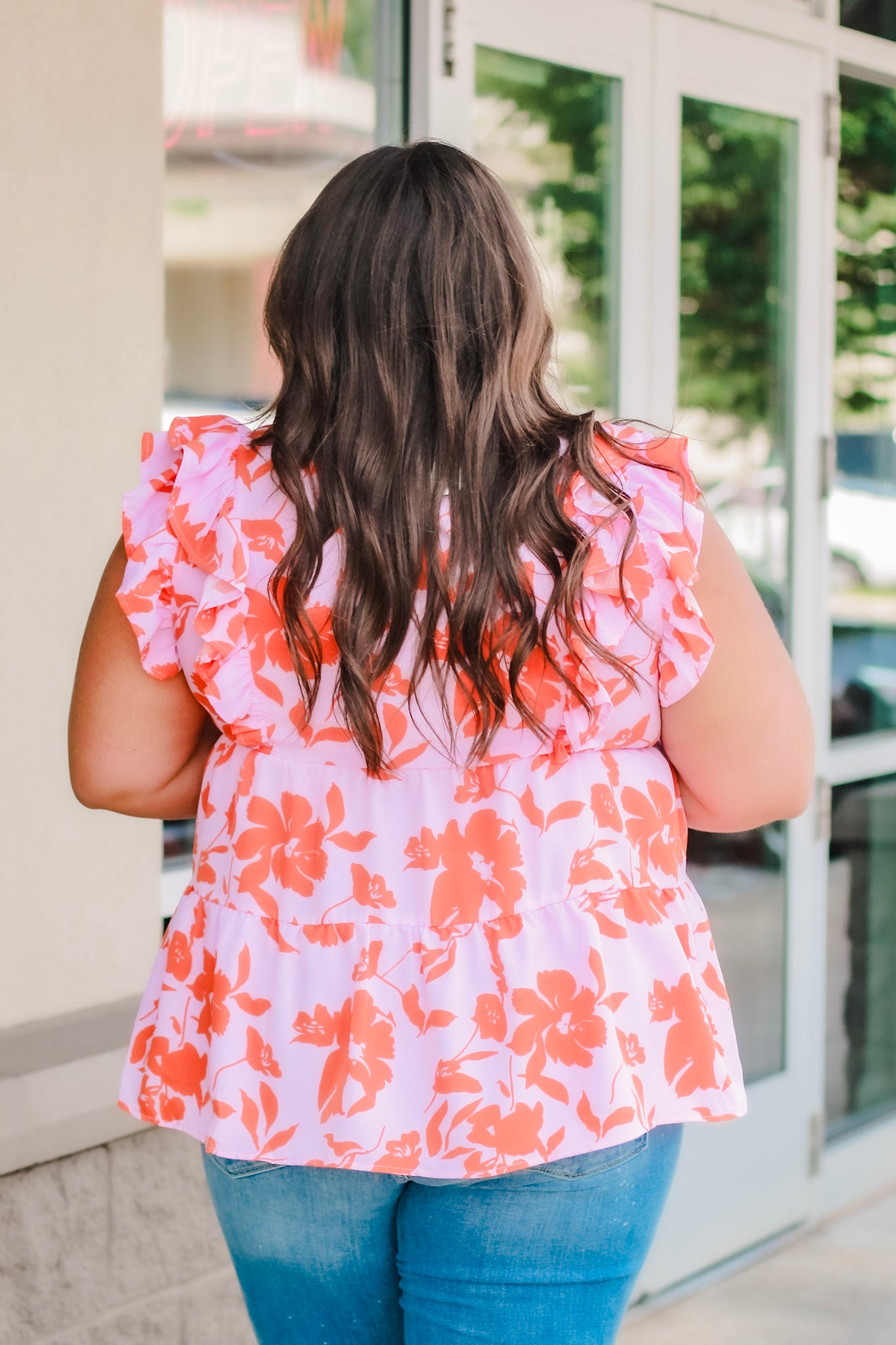- Pink/coral floral top