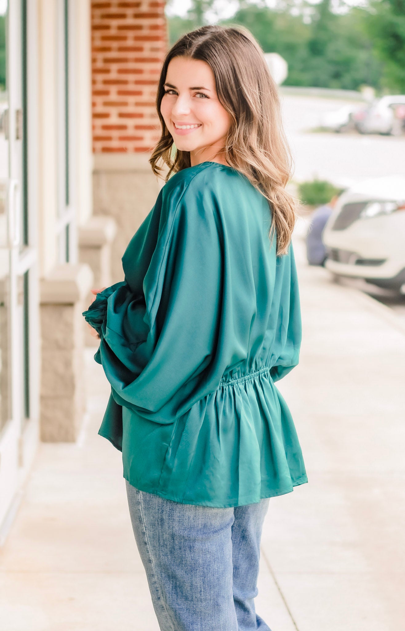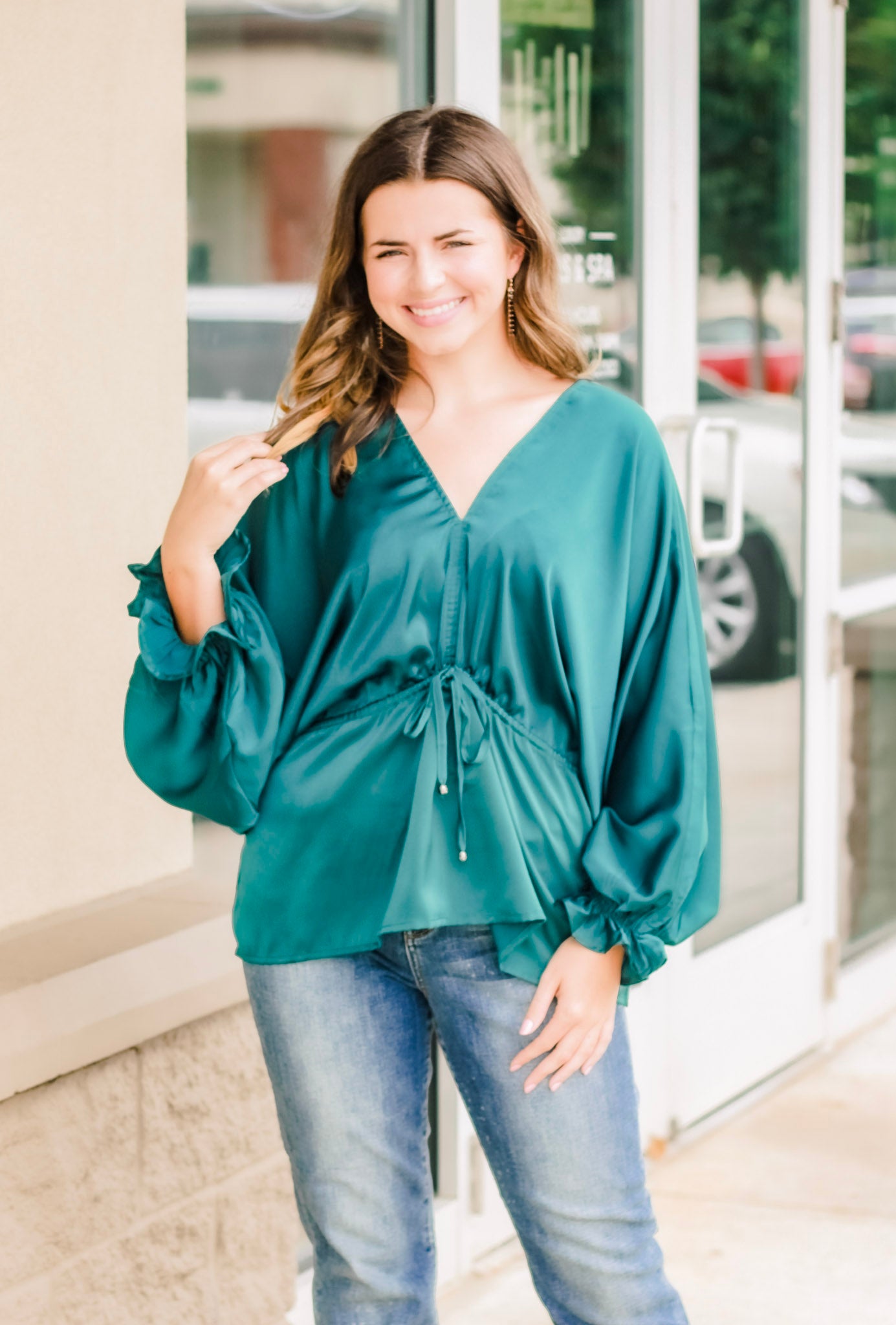 - Forest green satin blouse