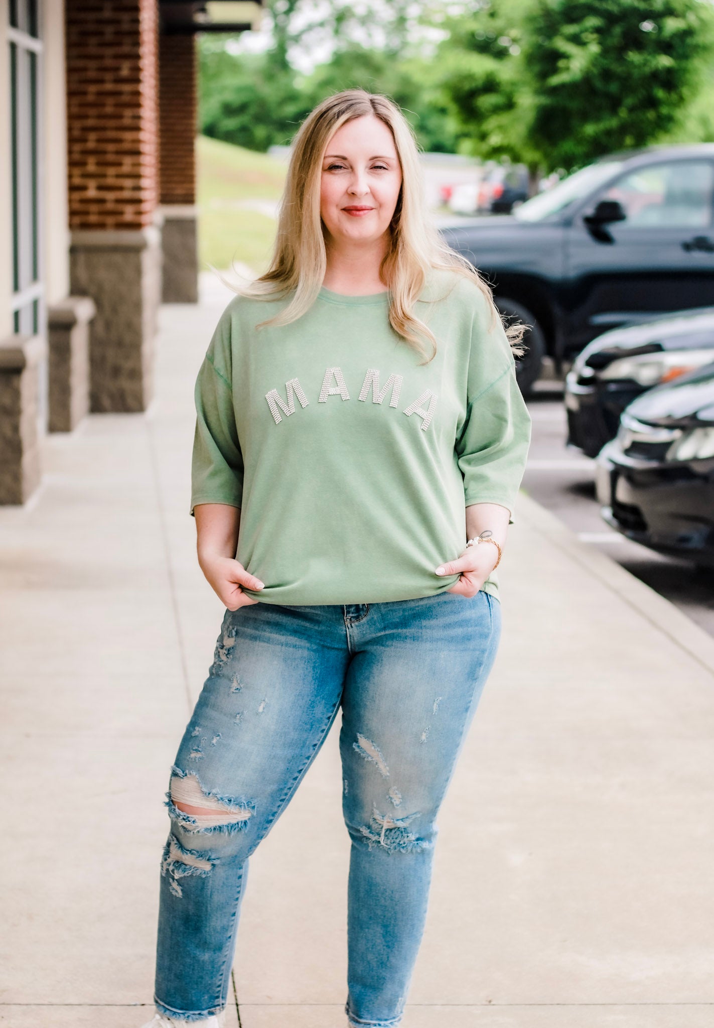 - Green stonewash "Mama" tee