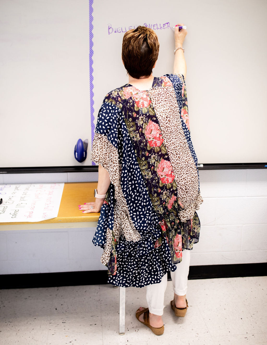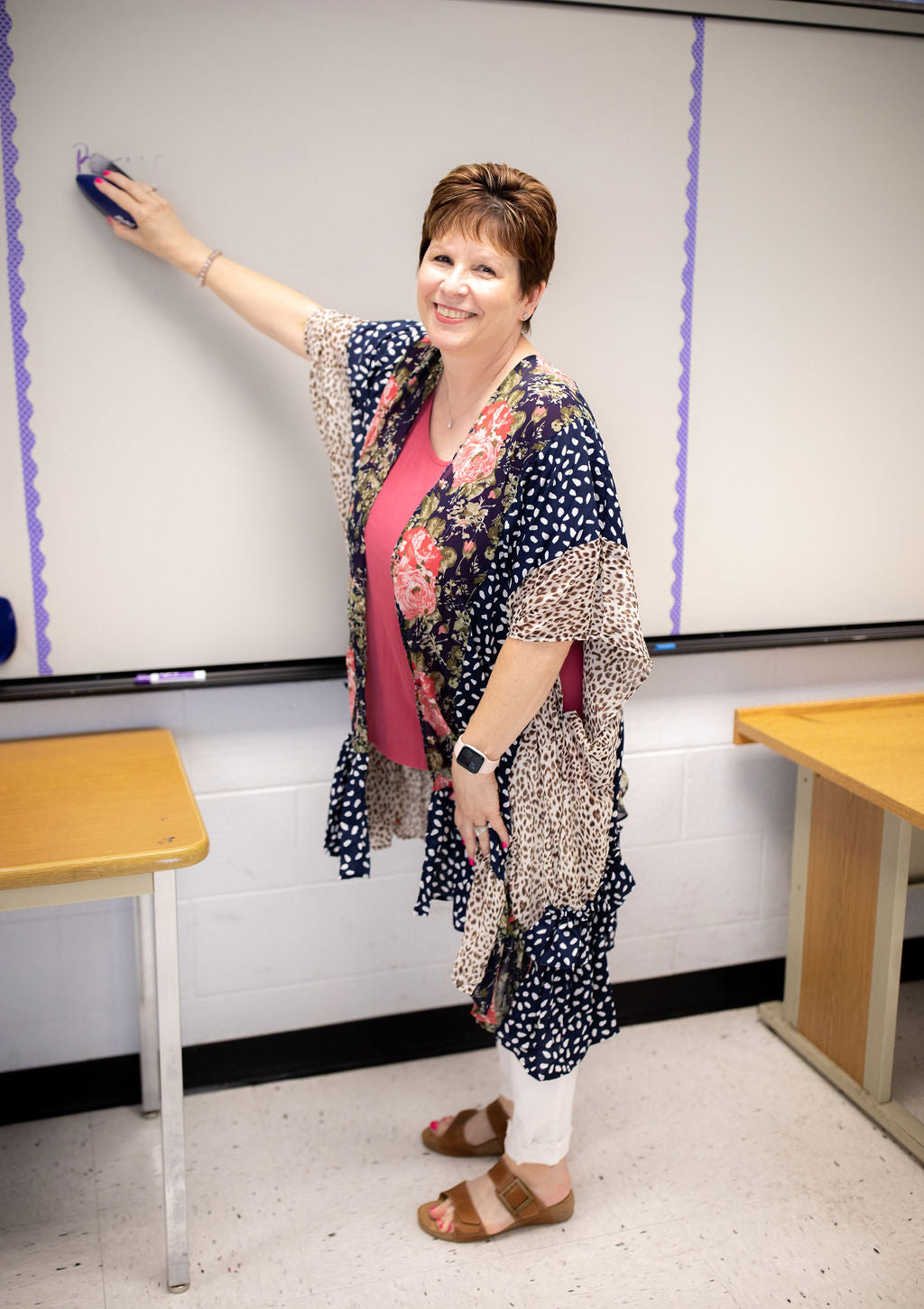 Kimonos are our favorite summertime layering piece! This beautiful navy kimono features a bold floral pattern. Layer it over your favorite white, pink, or olive top!