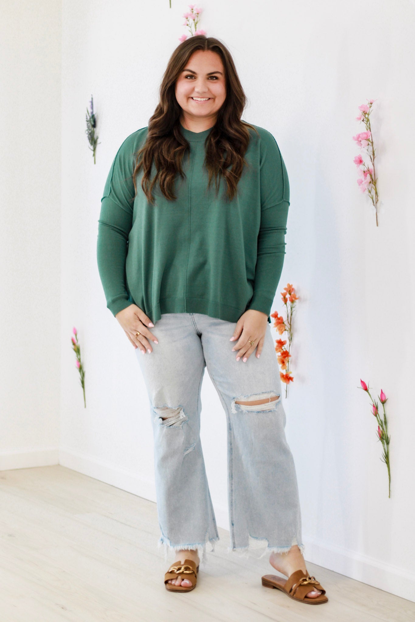 Solid long sleeve sweater top featuring a round neckline, exposed seams for added detail, ribbed cuffs, a ribbed bottom band and is a high-low design.