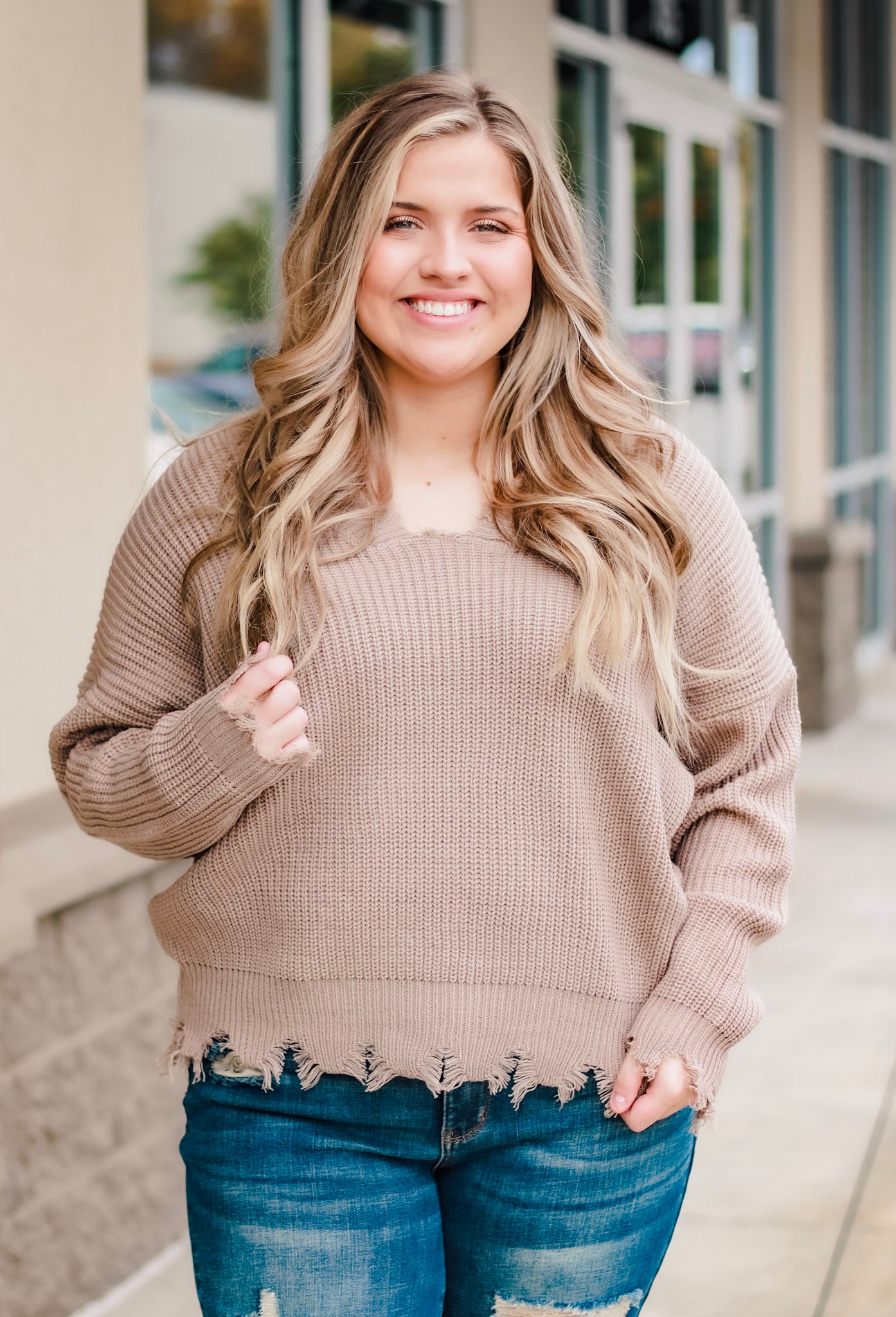 Check out this sweater! We are dying over the detail of the gorgeous ripped hemline. This beauty is such an easy choice to wear over your favorite pair of jeans. Add some cute shoes and your favorite accessories and you'll be ready to head out your door in style!