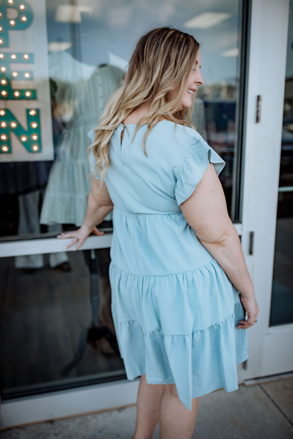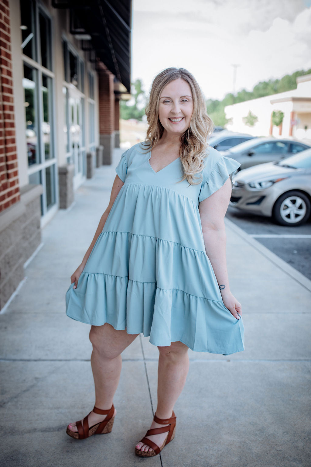 If you're headed to the beach then this dress needs to be in your suitcase! This color is a beautiful dusty blue and the dress features flattering tiers.
