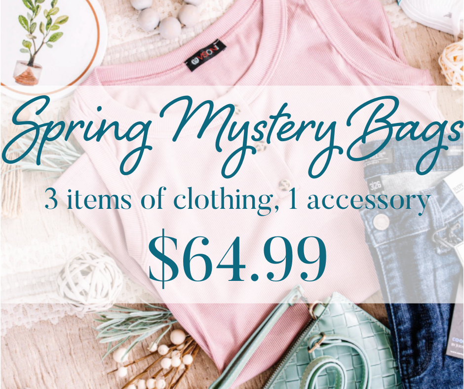 - The girls & I will be working directly with the warehouse to curate your mystery bag. Your items may be selected from our warehouse collection, in store collection or even collections that have yet to be released.