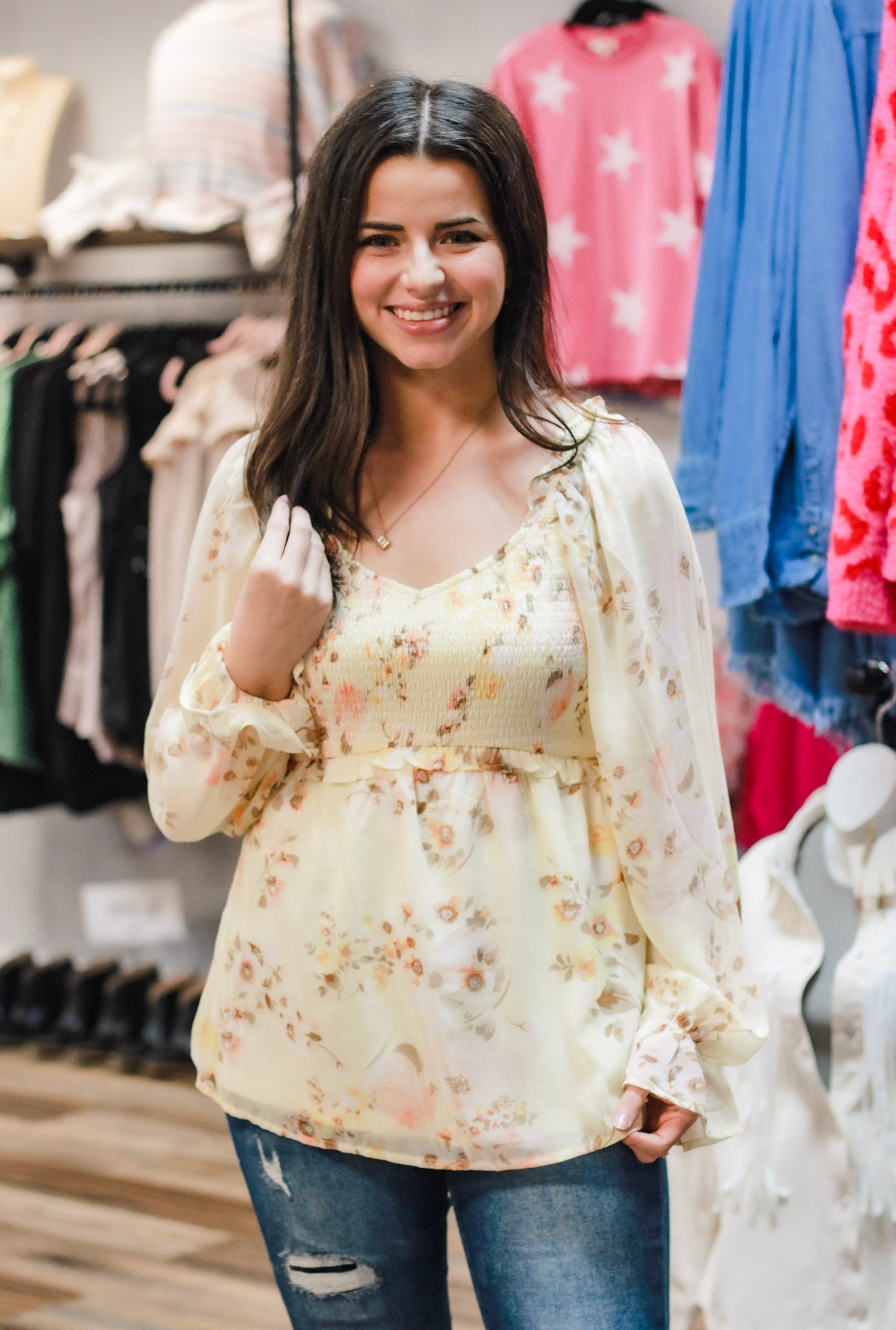 - Floral smocked blouse
