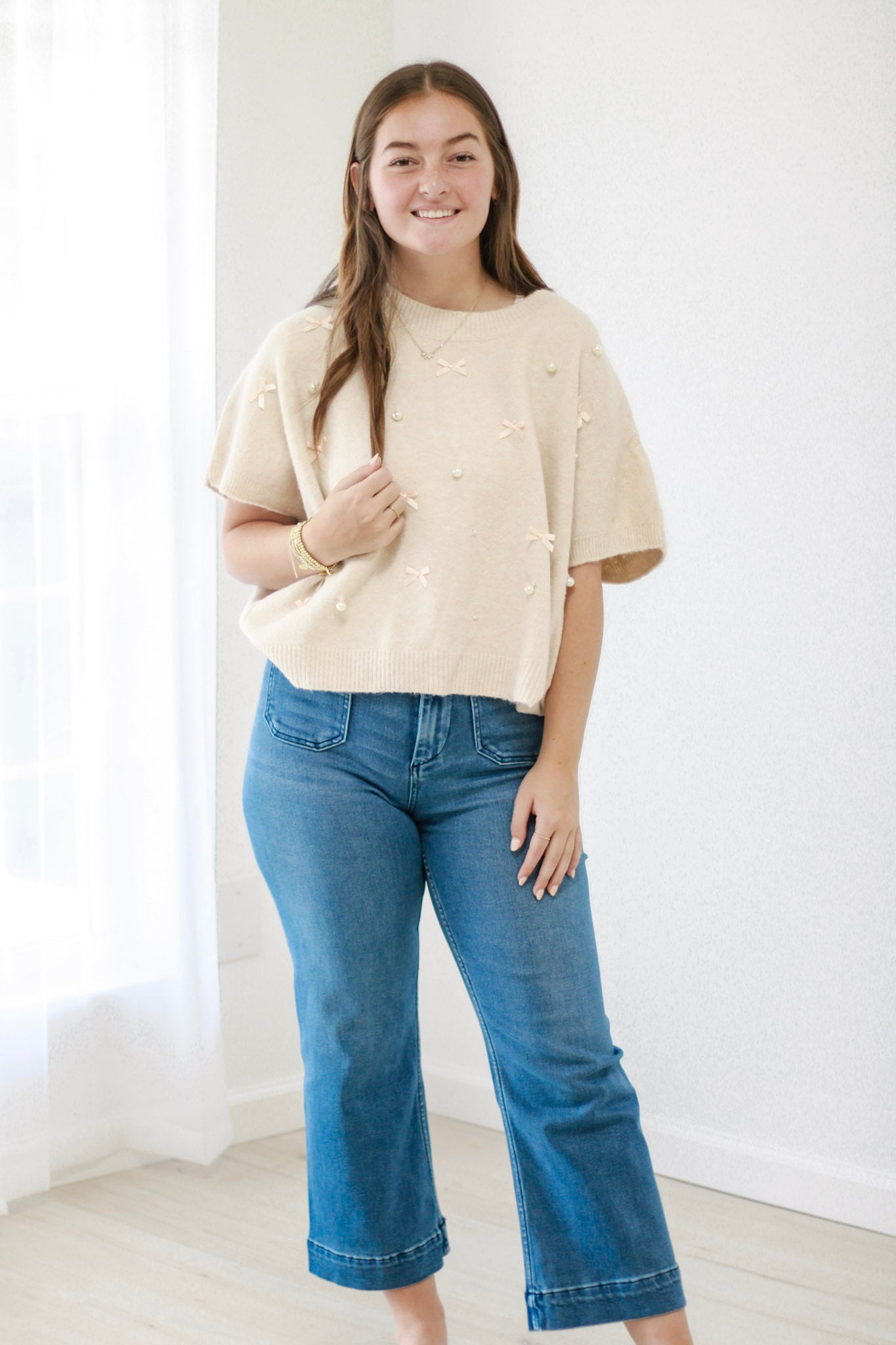 - Bow and pearl embellishments