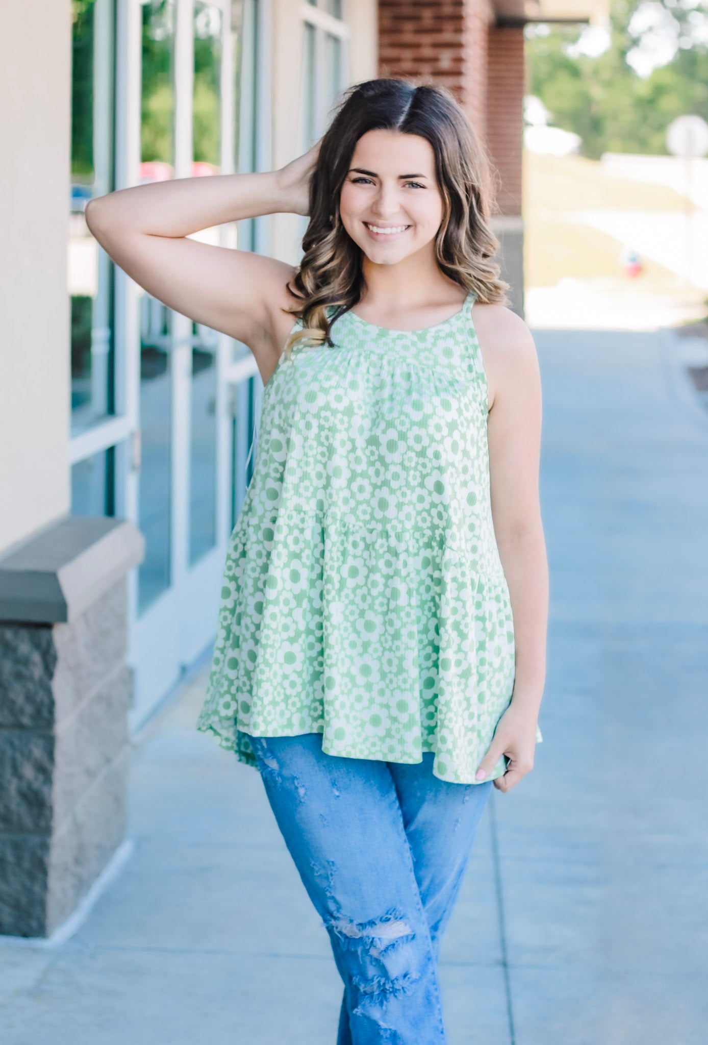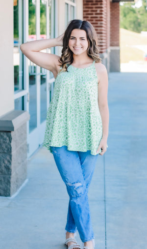 - Light kelly green tank with floral pattern