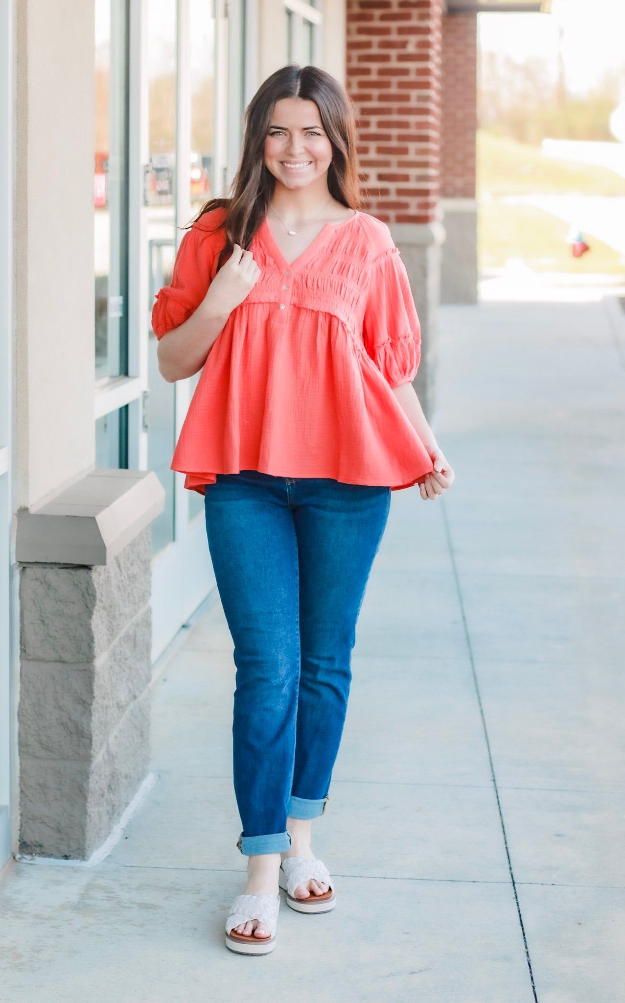 - Smock detail on chest; button down chest; puff sleeves