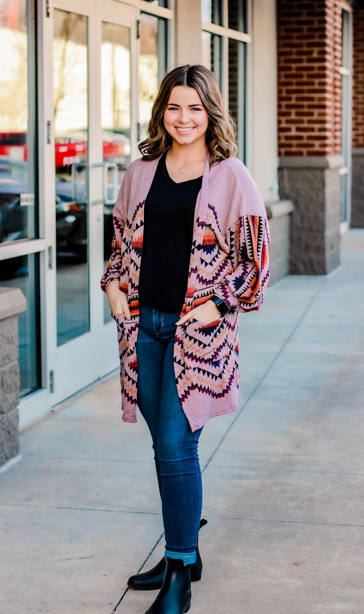 Looking for something to wear with that cowboy hat sitting in your closet? This is the cardigan for you! Even if you just dream of living on a ranch someday, this gorgeous cardigan is perfect. It's a great length to pair over your favorite skinny jeans or leggings, and has a color scheme that matches all your favorite tops for layering. Don't pass this one by!