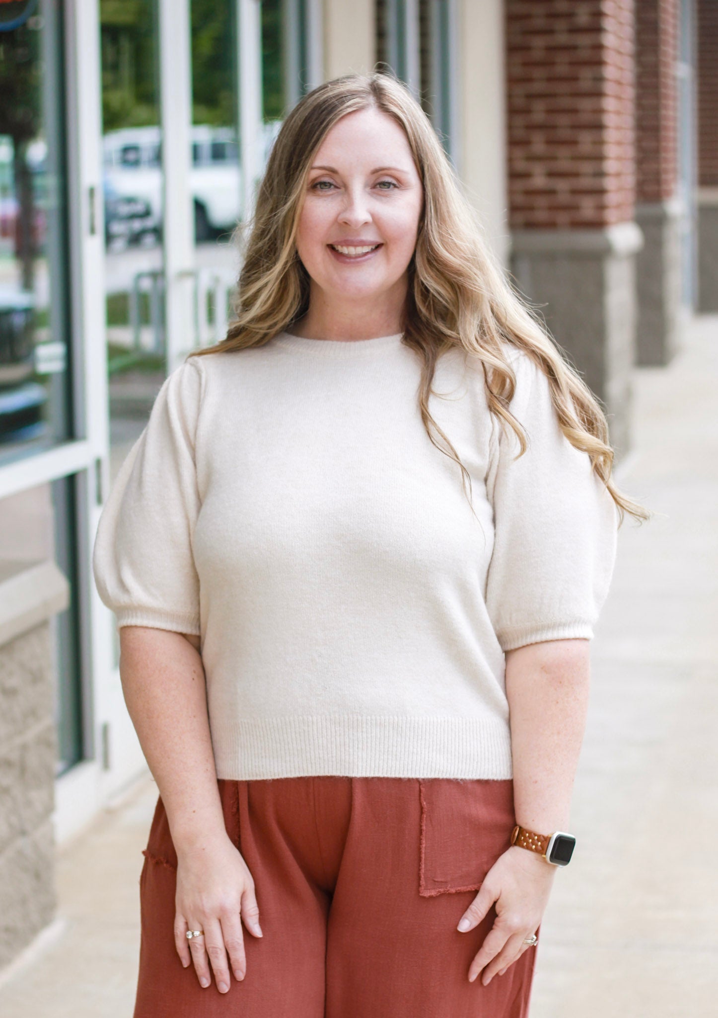 - Sand beige short sleeve sweater top